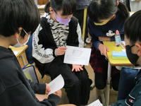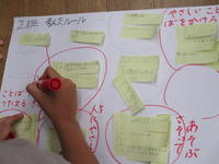 まず、どうしていじめが起こるのか、なくならないのかを出し合いました。その後、いじめを始めない・いじめが起こらないようにするためのルールを考え、班で練り上げていきました。「誘って遊ぶ」「優しい言葉かけをする」「言葉で伝える」など、相手の立場や気持ちを考えようとするルールを決めていました。
