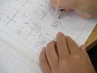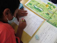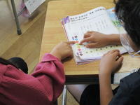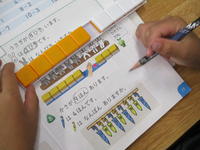 5年生算数では、面積の学習を一段落したところで、問題集を使って2学期の復習をしていました。鉛筆が止まっていた児童が、「ええっと、分数のたし算は…」と言いながら、教科書の分数のページをパラパラとめくり始めました。すると、前の席の児童が、「僕も、教科書とかノートを見たら思い出したよ!」