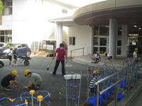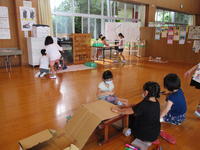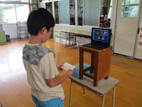1年算数「かたちあそび」では、身の回りにある立体図形について学習しています。算数の時間には、「かたちランドの王様」から手紙が届きます。前の時間には、「タワーや乗り物、滑り台を作ってほしい」という手紙をもらいました。子ども達は家から持ってきた空き箱を使って、先生の身長を追い越すほどのタワーや動く乗り物などを作りました。