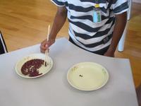 さて今日は、3時間目に2年生算数「水のかさの単位」の提案授業を行ってもらいました。「黒い水筒とピンクの水筒では、どちらが多く入るか」という問題場面でした。黒い水筒とピンクの水筒を見て「えっ!」とびっくり。子どもたちは、「黒い水筒にはカップ2杯、ピンクの水筒にはカップ3杯入った」と聞いていたので、てっきり黒い水筒の方が小さいと思っていたのでしょう。