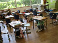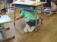 どこに不審者がいるのか情報が入ると、ドアを施錠して子ども達は身をひそめました。訓練後の振り返りでは、不審者がいる場所によって、施錠するところや身を潜める位置をどこにすればよいのか、子ども達に考えさせていました。