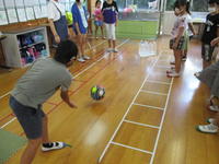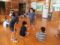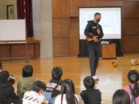 子ども達は、空手の基本的な動作だけでなく、鼻から吸って口から吐く呼吸法や、おなかから声を出すことなどを松岡さんから実技指導していただきました。