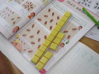 さて、今日は、1年生が算数でひき算の学習をしていました。「かさが9ほんあります。あおいかさは、4ほんです。きいろいかさは、なんぼんありますか。」ブロックを9個出して、青い傘の分4個を白い面にひっくり返すと、黄色い面が5個になりました。1年生では、このように操作活動をすることで、少しずつ念頭で計算できるようにしていきます。