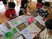 3・4時間目の図工では、その解放感もあったのか、運動会の思い出を語りながら色版画を仕上げていました。三角旗の下を走り抜ける姿、バトンを次の走者に渡そうと必死に走る姿、ボンボンを持って楽しそうに踊る姿など、カラフルに思い出がうつし出されました。