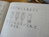 前の時間には、おはじきを使って考えました。今日は、一つレベルアップして、おはじきを使わないで考えようというものでした。子どもたちは、図や式を書いて「20÷5の計算は、5の段の九九を使えばよい」という結論になりました。試しに「35÷5」を考えると、やっぱり5の段で計算できます。