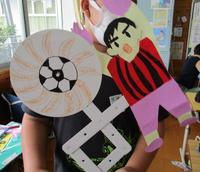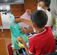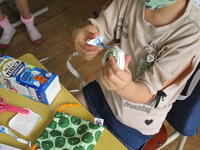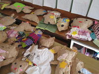 右の写真は、2年生が図工の時間に作った「ギュッとしたい私のお友達」です。もんだ紙を膨らませて立体的にし、色紙や布で服をまとわせています。1・2年生では、季節を感じたり、身近にある物を使ったりして製作を楽しんでいます。