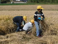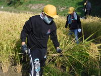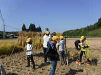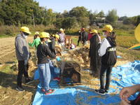 先日、かけ干ししていた稲を脱穀するときがきました。米の水分量がほどよい加減になったということで、5年生が昔ながらの脱穀に挑戦です。