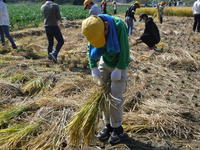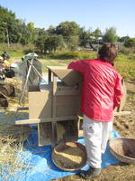 足踏脱穀機で稲の穂先から籾を落とした後、唐箕(とうみ)で籾と藁くずや籾殻をわけていきました。現在の脱穀機での作業と比べると、時間もかかり大変な作業でしたが、農作業を効率よく改善していく人間の知恵を体験することができたようです。