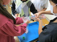 今日は、「使った箱を形の仲間に分けてほしい」という手紙と、いろいろな立体が入った大きな袋が届きました。2・3人のグループで、「これはほそなが四角」「これは転がる仲間」などと言いながら仲間わけをしていきました。全体で意見を出し合って、大きくは「四角の仲間」と「転がる仲間」に分けることにしました。さらに、「四角の仲間」は「ほそなが四角」と「さいころ四角」に、「転がる仲間」は「筒の仲間」と「まんまる仲間」に分けることにしました。