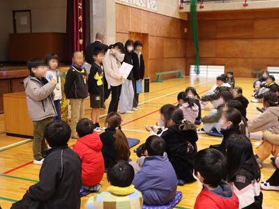 4月12日(金)に1年生の歓迎会と歓迎遠足を実施しました。歓迎会では、1年生が大きな声で自己紹介をすることができました。その後で、児童会執行部が「なかま集めゲーム」をして1年生とみんながふれあって楽しみました。最後に、執行部から「早く1年生の名前を覚えましょう」と呼びかけがありました。