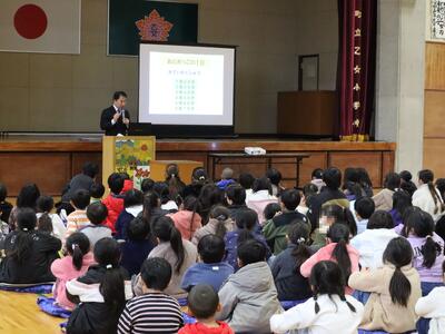 9月9日(火)の3校時に、船津地区の森田義勝さんを招いて乙女の宝集会を開催しました。森田さんは、10年前から船津地区の登下校時のバスの見守りをされています。