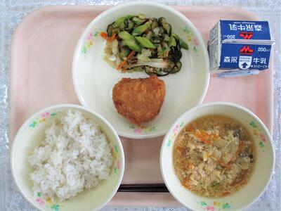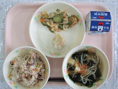 たこ飯、豆腐焼売、レンコンの梅和え、すまし汁、牛乳