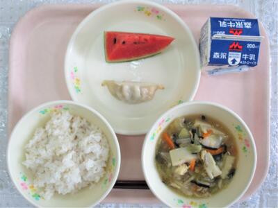 八宝菜、焼き餃子、すいか、麦ご飯、牛乳