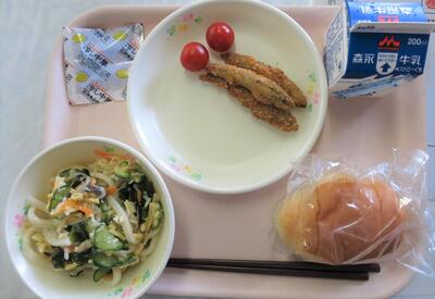 冷やしうどん きびなごフライ ミニトマト ロールパン 牛乳