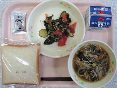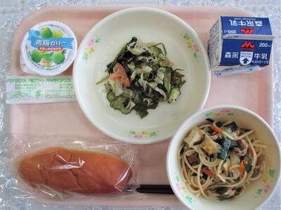豚キムチめん、海藻サラダ、ミルクパン、梅ゼリー、牛乳