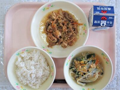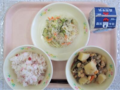 大豆の五目煮、春雨の胡麻だれ、カリカリ梅ご飯、牛乳