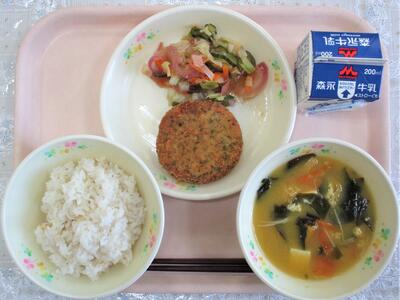 大豆のフライ、味噌汁、赤タマネギサラダ、麦ご飯、牛乳