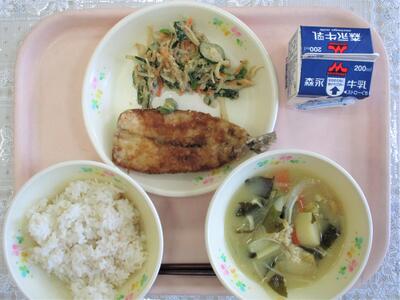 イワシの蒲焼き、ごま和え、味噌汁、麦ご飯、牛乳