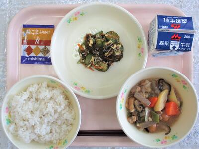 ジャガイモのうま煮、もずくの酢の物、ふりかけ、麦ご飯、牛乳