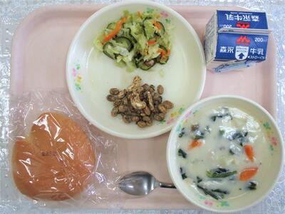 ナッツのかりんとう、ジャガイモのクリーム煮、フレンチサラダ、丸パン、牛乳