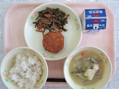 レンコンのはさみ揚げ、茎ワカメのきんぴら、豚汁、麦ご飯、牛乳