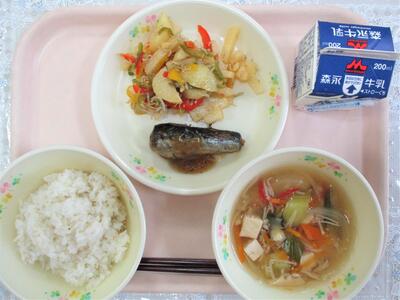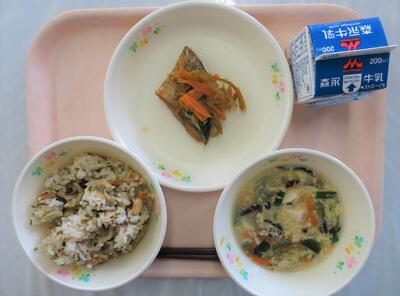 イワシの梅煮、じゃこじゃがサラダ、五目汁、麦ご飯、牛乳