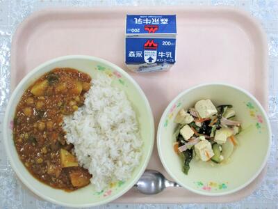 ひよこ豆のドライカレー、豆腐サラダ、牛乳
