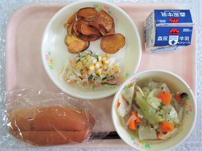 「野菜チップス」は、サツマイモとゴボウを油で揚げてあります。歯ごたえがある「かみかみメニュー」です。よく噛むことで、食べることを意識したいですね。