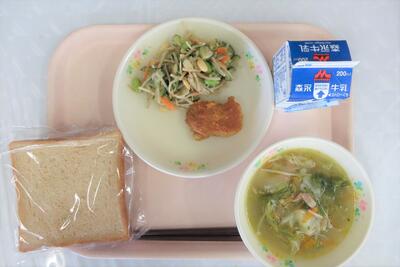 タンドリーチキン やさいスープ ごぼうサラダ 黒糖パン 牛乳