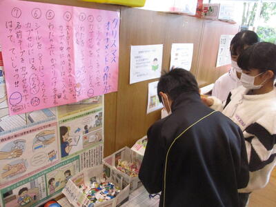 「落ち葉」「どんぐり」「松ぼっくり」などを材料にして「けん玉」「迷路」「マラカス」「魚釣り」「コマ」などを作り、みんなで遊べるように多目的ホールにコーナーを設置しました。それぞれのコーナーでは、1年生が上級生に上手に遊び方を教える姿が見られ、とてもほほ笑ましかったです。