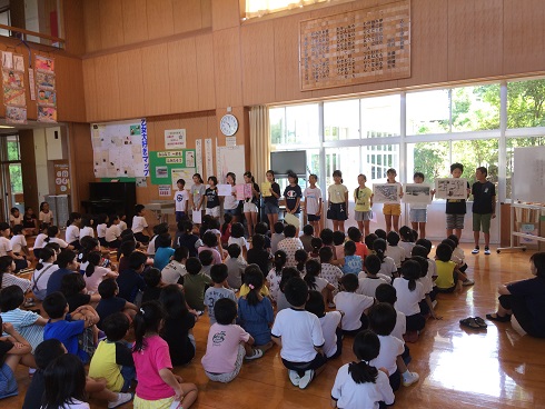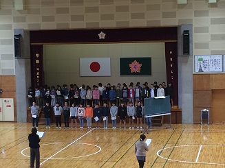 高学年と低学年でそれぞれ1作品を読み上げます。「こころを一つに」「息を合わせて」。仕上がりが楽しみです。
