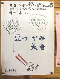 初日の今日は、昼休みに早速挑戦者がホールに集まり、給食委員の見守る中、豆つかみ競争で盛り上がりました。今日の最高は30秒で22個。あさってまでの期間中、どんな強者が登場するか楽しみです。