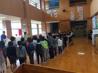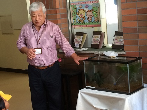 水槽は、みんなが観察できる玄関に設置され、設置後は熊本国際化センターの谷川さんより子どもたちにメダカのお話をしていただきました。