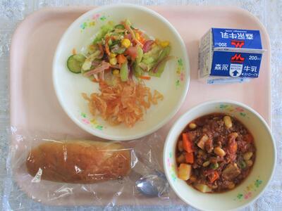 チリコンカン、赤玉ねぎサラダ、レンコンチップス、玄米パン、牛乳