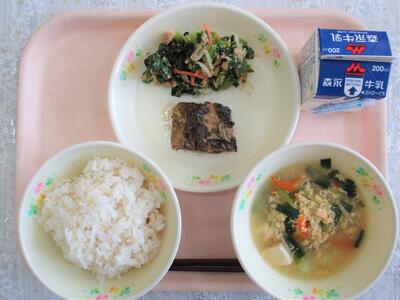 サバのしょうが煮、こまツナ和え、ニラ玉みそ汁、麦ご飯、牛乳