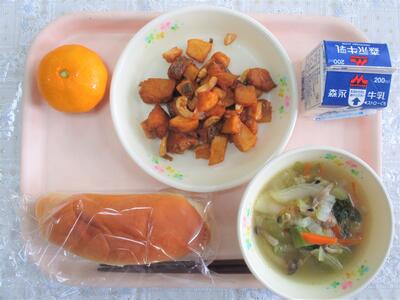 魚のカシューナッツ炒め、ラビオリスープ、みかん、ミルクパン、牛乳