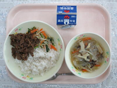 セルフビビンバ丼、春雨スープ、牛乳
