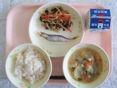 せんだご汁、焼ししゃも、おかか和え、麦ご飯、牛乳