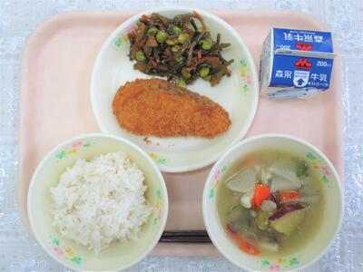 茎ワカメのきんぴら、鮭フライ、さつま汁、麦ご飯、牛乳