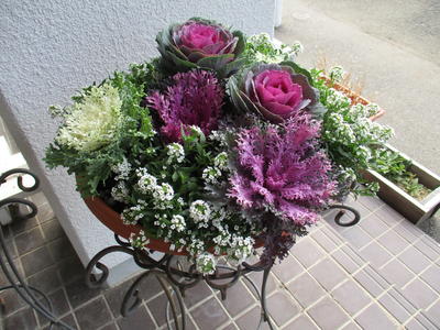 正面玄関には、おしゃれな鉢植えが飾られました。主事の伊藤先生が植えてくれたものです。葉ボタンやアリッサムの寄せ植えで、白・紫・緑の色使いがなんともほどよい加減です。アリッサムは、春になると一気にその花が咲き広がる様子から、「飛躍」という花言葉があるそうです。来年は、今年以上に飛躍の年になりますように…