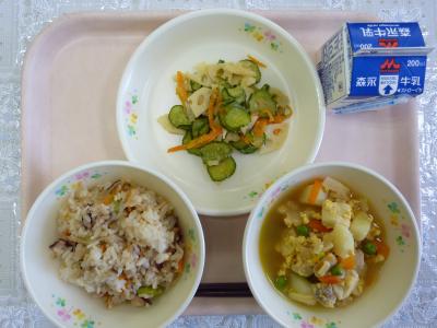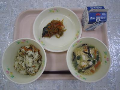 たこ飯、高野豆腐の卵とじ、レンコンの梅和え、牛乳