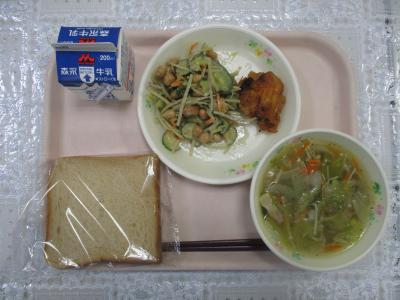肉みそビーフン、トマトの中華サラダ、食パン、きなこクリーム、牛乳