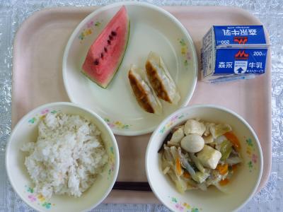 八宝豆腐、焼き餃子、すいか、麦ご飯、牛乳