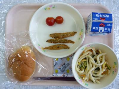 冷やしうどん、きびなごフライ、ミニトマト、ロールパン、牛乳