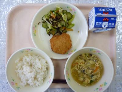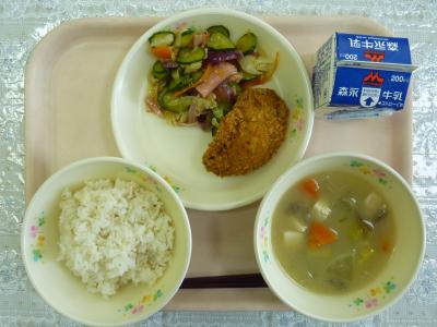 肉野菜炒め、中華スープ、麦ご飯、牛乳
