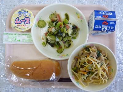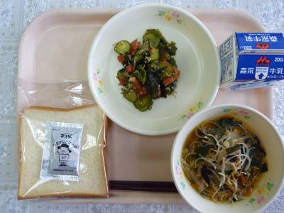 豚キムチめん、海藻サラダ、ミルクパン、ムース、牛乳