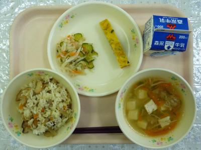 山菜ご飯、千種焼き、豆腐のくずあん汁、なます、牛乳