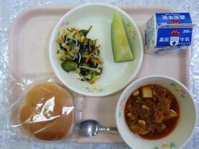 チリコンカン、海藻サラダ、丸パン、メロン、牛乳