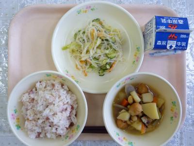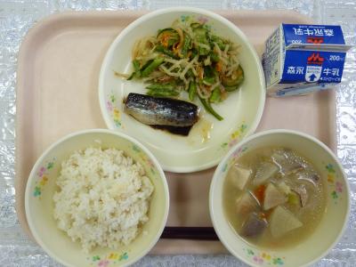 いわしのショウガ煮、味噌けんちん汁、ゴマ和え、麦ご飯、牛乳