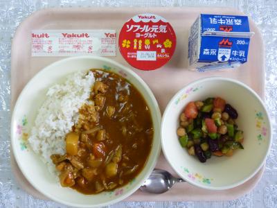 チキンカレーライス、コロコロ豆サラダ、ヨーグルト、牛乳